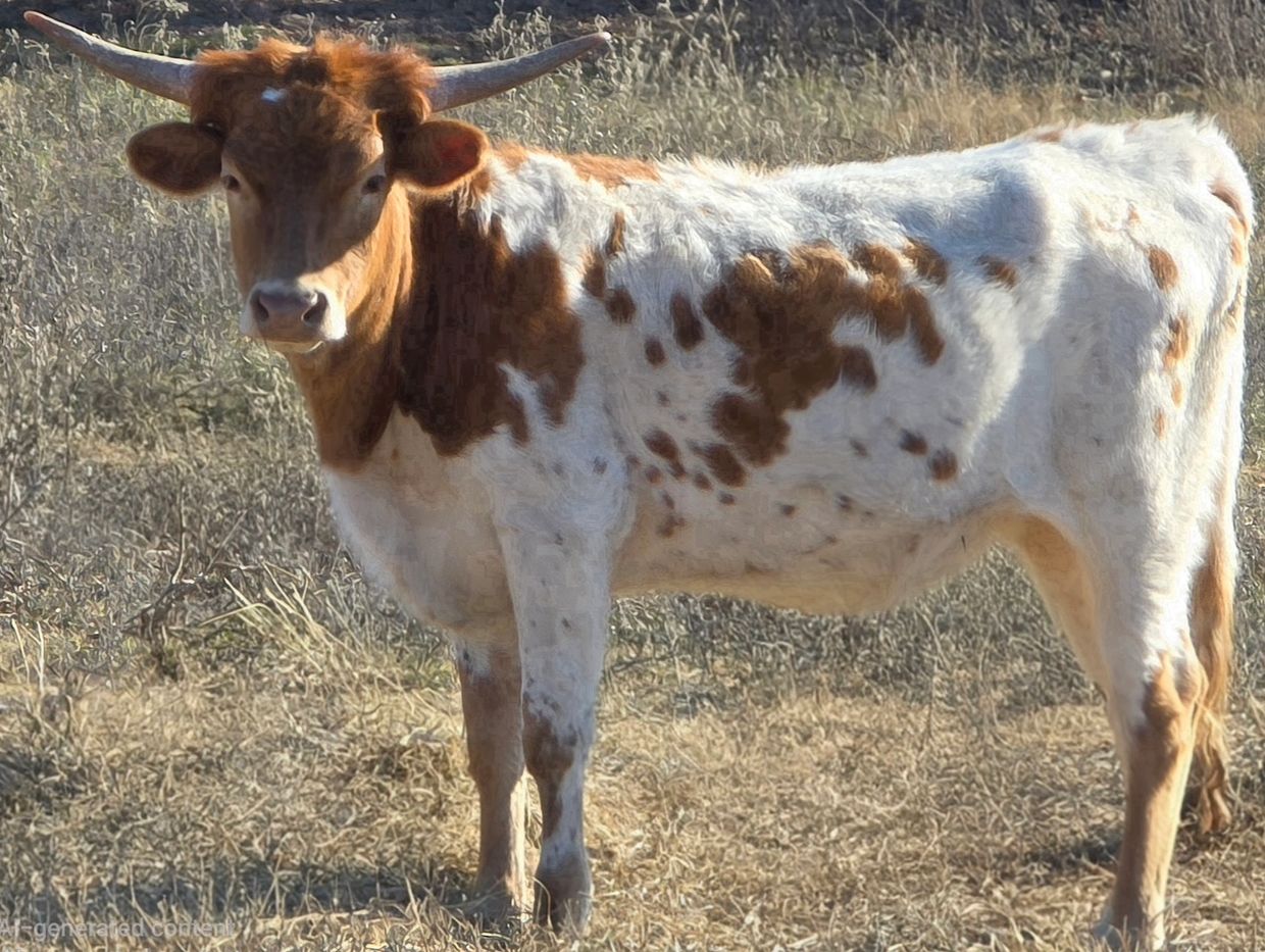 SHE HAS A SHY BUT CURIOUS PERSONALITY AND CONTINUES TO GROW MORE COMFORATABLE WITH PEOPLE EACH DAY. AS SHE MATURES, WE LOOK FORWARD TO WATCHING HER DEVELOPE INTO ANOTHER STRONG PRODUCING FEMALE WITHING THE LEWIS LONGHORNS HERD.