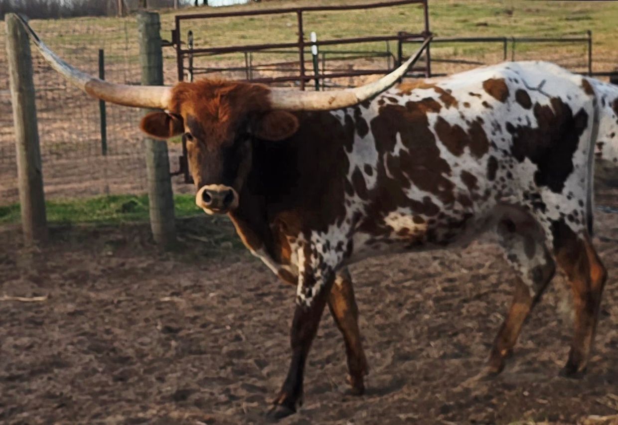HER FIRST CALF, A STRIKING RED AND WHITE WITH BRINDLE MARKINGS AND A BRINDLE FACE, SHOWCASES THE COLOR AND STYLE SHE IS CAPABLE OF PRODUCING. WITH HER FLASHY PHENOTYPE AND STRONG PEDIGREE BACKING HER, UNTAMED EMPRESS IS A YOUNG FEMALE WITH EXCITING FORWARD POTENTIAL IN THE LEWIS LONGHORNS PROGRAM.