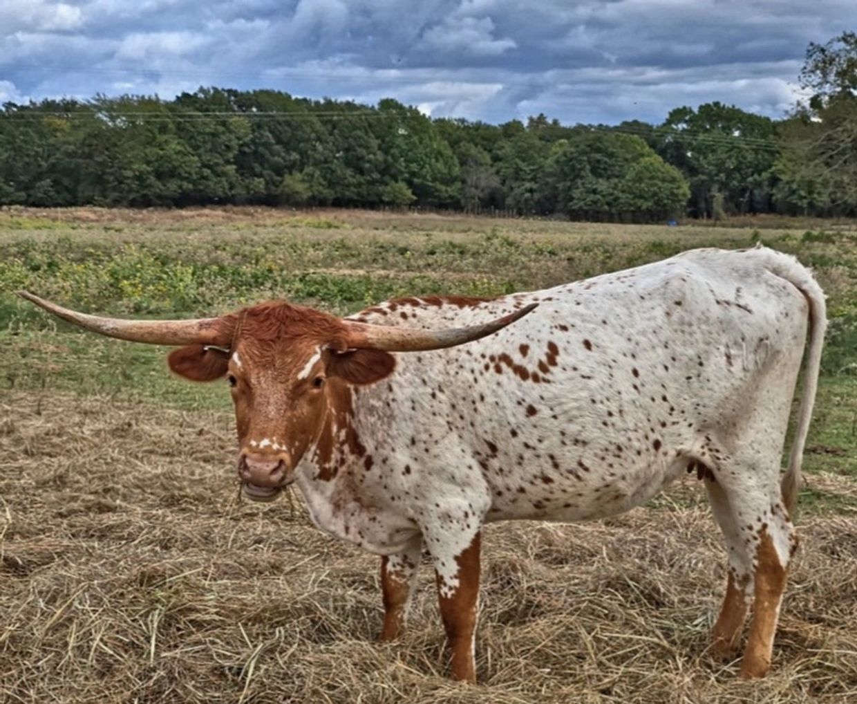 LL VIXEN'S LEGACY IS A FLASHY YOUNG FEMALE CARRYING FORWARD THE INFLUENCE OF THE BELOVED VIXEN LINE. SHE DISPLAYS A FEMININE FRAME, BALANCED STRUCTURE, AND ATTRACTIVE LATERAL HORN DIRECTION, ALONG WITH A BEAUTIFUL SPECKLED RED AND WHITE PATTERN THAT MAKES HER STAND OUT IN THE PASTUTRE.